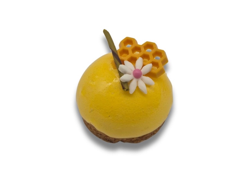 Bloesem gebakje met honing–sinaasappel bavarois op krokante koekbodem